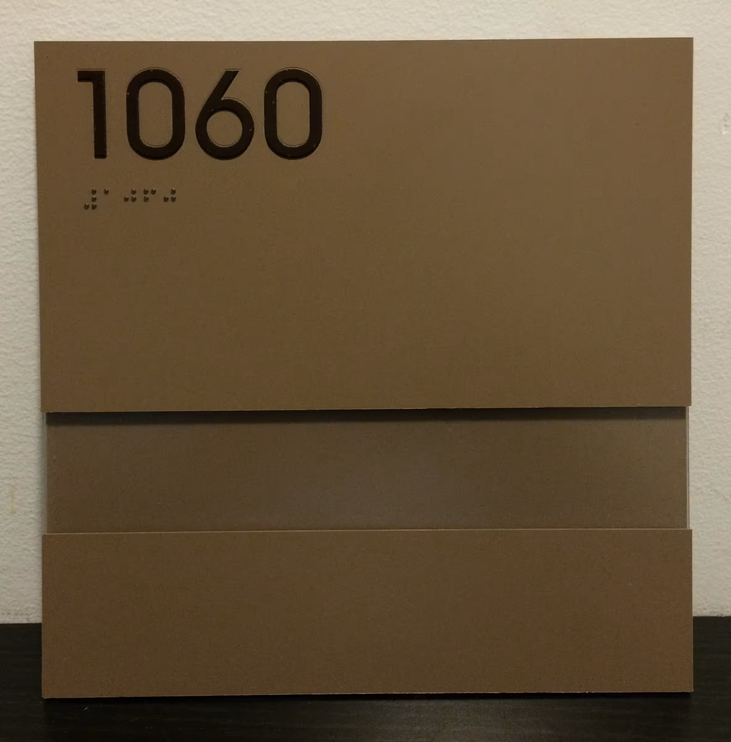 - A CNC (Computer Numerical Control) machine is used to create insertion points for the braille beads, and to cut out the raised elements. A laser or CNC Router is then used to cut out the final shape of the sign (typically 6″ x 6″). Signs can be mounted with very high bond (VHB) tape or fastened with standoffs.